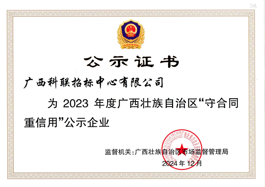 为深入贯彻落实党的二十届三中全会关于健全社会信用体系和监管制度的决策部署,进一步优化营商环境,激励企业诚信经营,广西壮族自治区市场监督管理局组织开展了2023年度“守合同 重信用”企业公示活动。科联公司凭借卓越的合同履约能力、规范的信用管理体系及高度的社会责任意识成功入选,彰显了企业在诚信经营和社会信用建设中的标杆作用。