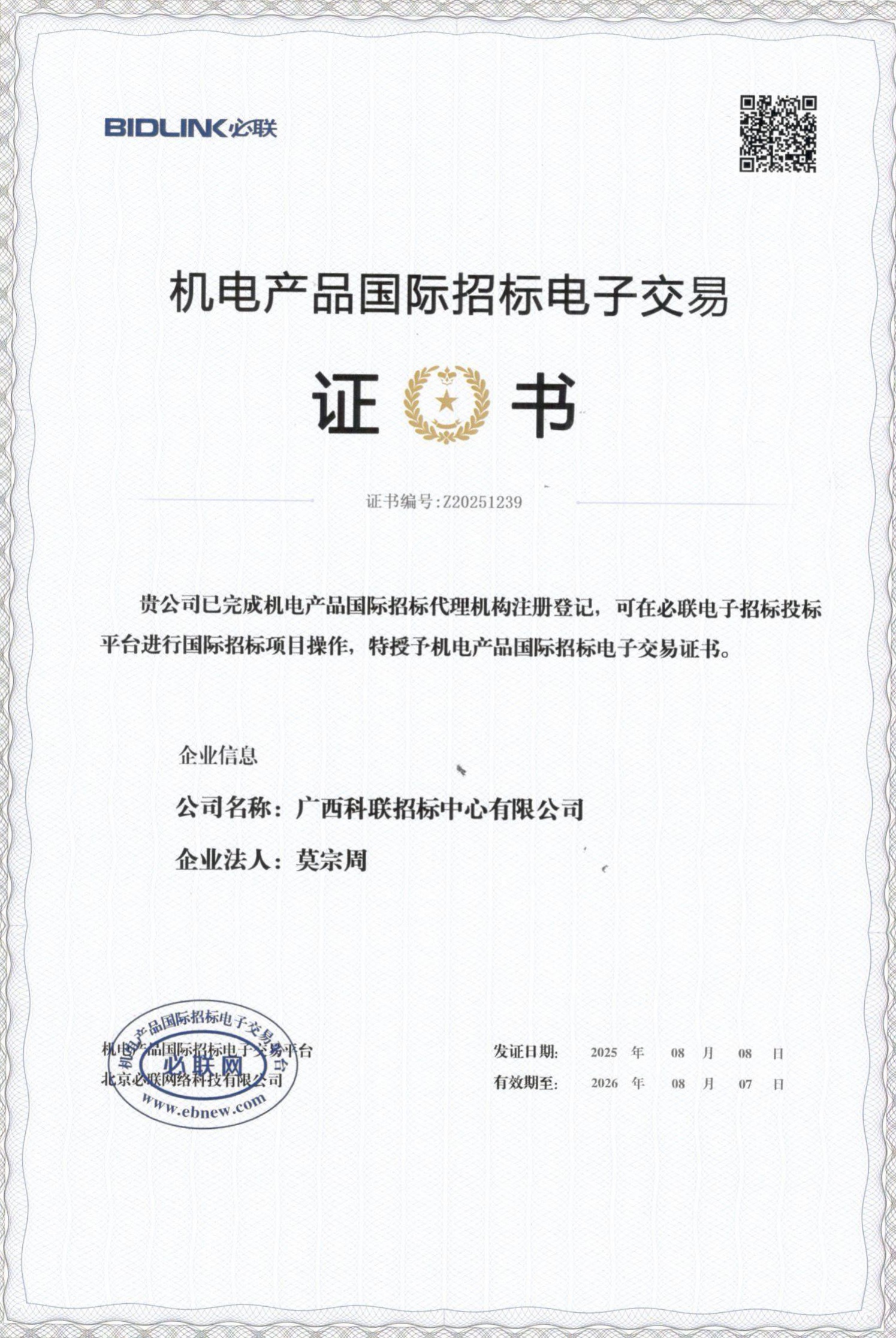 已完成机电产品国际招标代理机构登记注册,并获得有效的《机电产品国际招标电子交易证书》